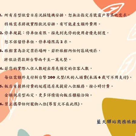 Het comfortabele pand ligt op ongeveer 15 km van de luchthaven Tainan en op enkele minuten rijden van culturele bezienswaardigheden zoals het Nationaal Museum voor Taiwanese Literatuur. Blue Sky is op 25 minuten wandelen van Fort Provintia gelegen. Bezoek het Tainan-park, op 2 km van het pand in Tainan, en voel de harmonie met de natuur. De bushalte Wennan Road is op een paar meter van Blue Sky Hotel.